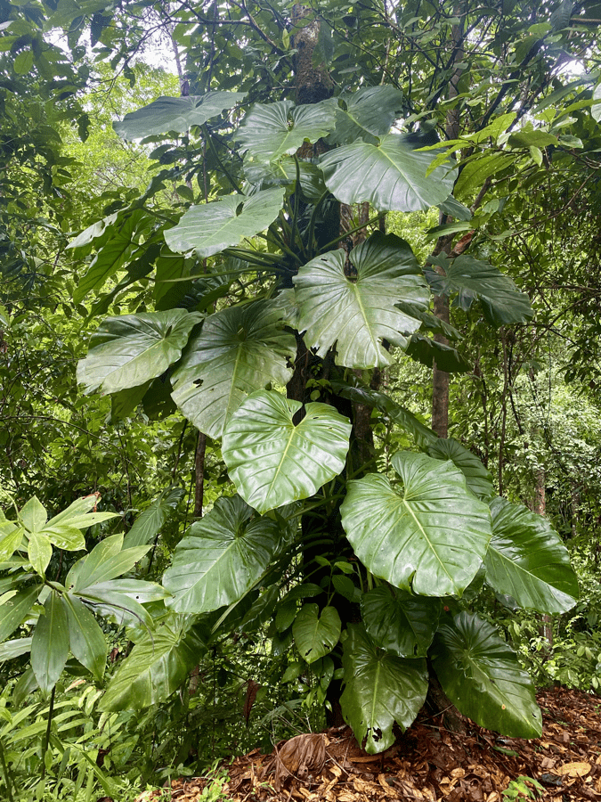 Today was a relatively easy day. It clouded-up early and started raining about 11:30 am, several hours earlier than other rainy days. We were near our destination but still walking when it started raining so most of us stopped to put on our rain gear.  We walked the last 30 minutes or so in a downpour. Our shoes were soaked in minutes.  We were happy to take off our raingear and sit under cover watching the many birds that were attracted to a couple of feeders located by the outside eating area. The rain eventually let up and we had several hours in the afternoon to explore the lush surrounding of Esquipilas rainforest.