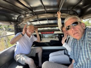 There are many narrow streets and alleys with no organized public transportation. What Chiang Mai does have are scores of scooters, motorcycles with sidecars, tuk tuks, and songthaews (converted pickup trucks with benches and a cover over the bed that will take you where you want to go for a negotiated fee). As I would come to learn, this was not unique to Chiang Mai as we saw similar modes of transportation all throughout northern Thailand and Laos. It is very common for people on scooters and motorcycles to weave through stopped cars to get to the front of the line at traffic lights like these girls were doing on their way home from school.
