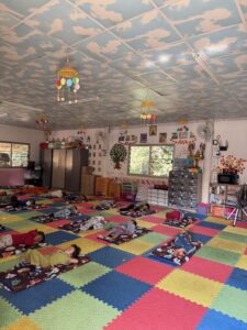 We visited the school at nap tim and spoke quietly while the students were quietly laying on their mats. Some, but not all students where actually sleeping.
