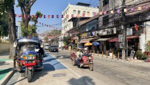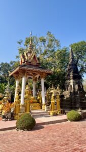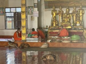 The morning walk down to the Mekong river and back took me by some interesting sites. I needed to get some more cash so was also on the look out for an atm. There are a lot of banks and atms in Vientiane, but not all of them like foreign cards. The first one I tried didn’t recognize my card, the second one ate my card for several minutes until the session timed out and my card returned (a little disconcerting), but the third atm dispensed a couple million kip without issue.